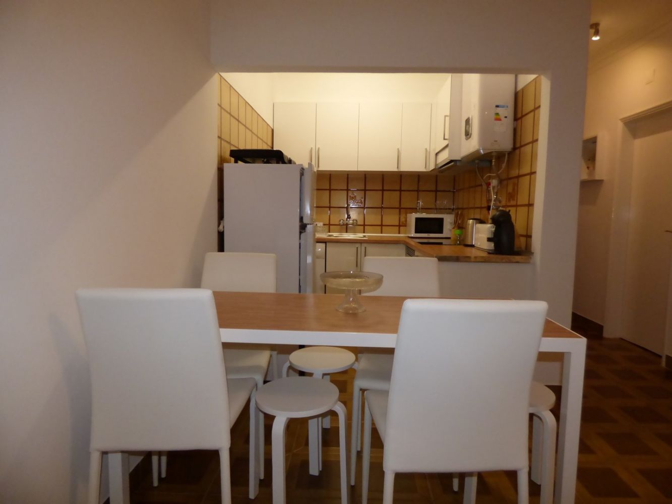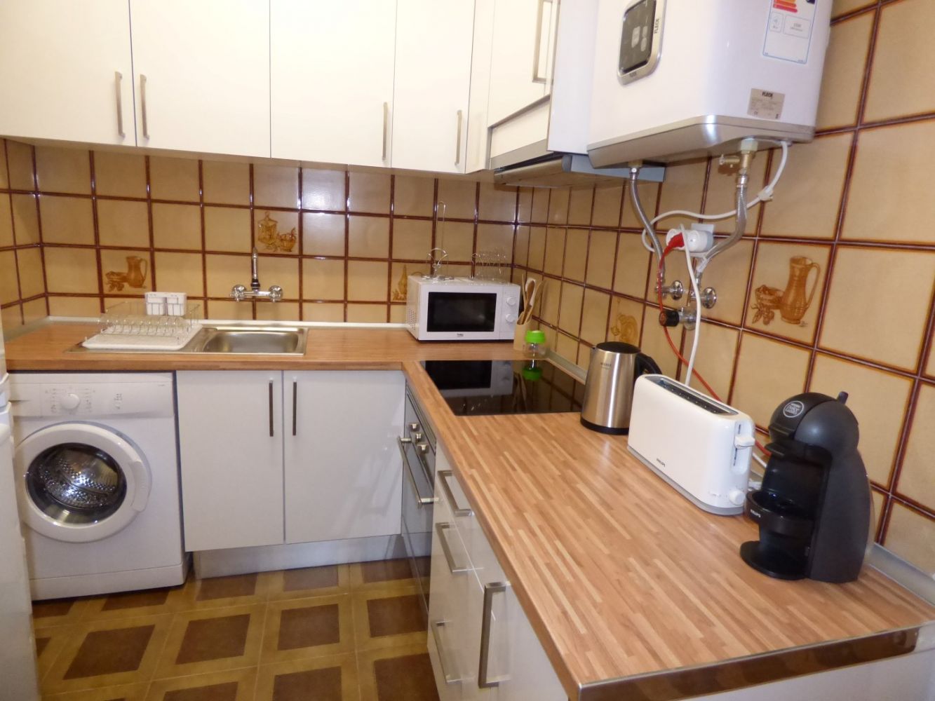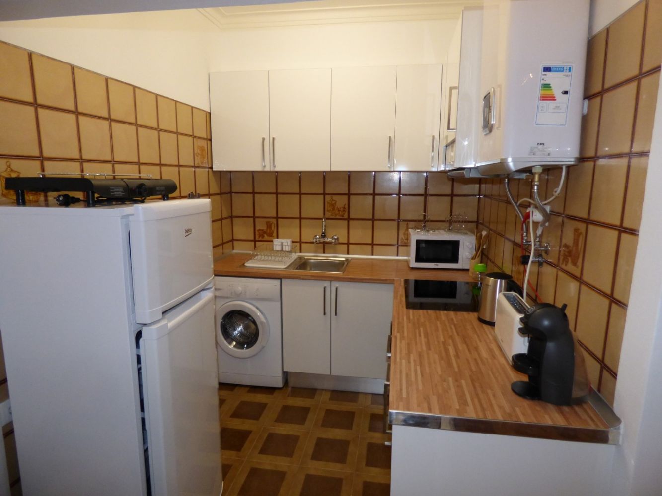 Cozinha equipada com M. Lavar Roupa, talheres, trem de cozinha, torradeira, varinha, placa eléctrica, forno micro-ondas, frigorífico e outros utensílios.