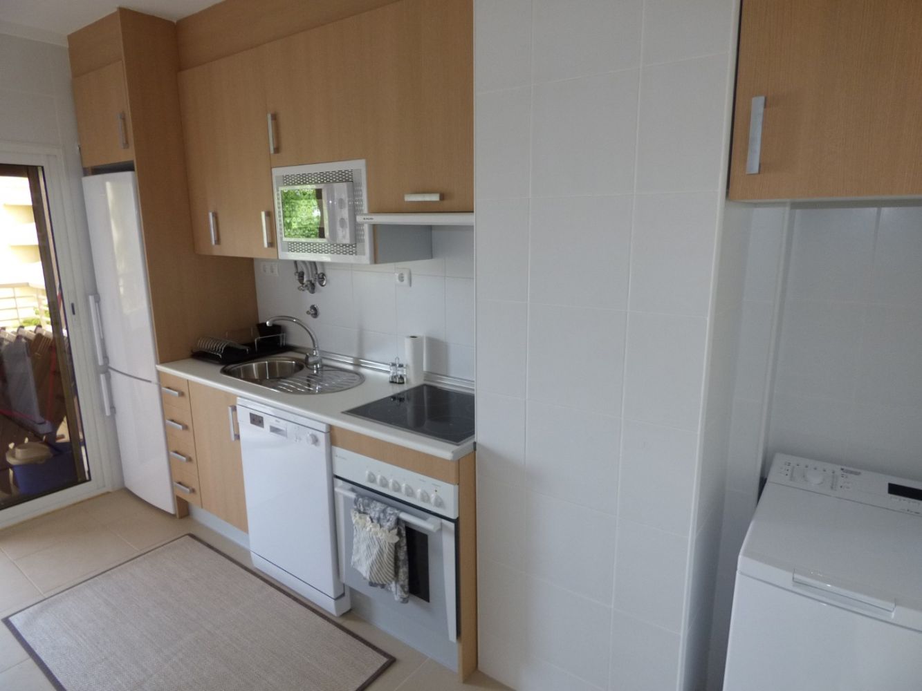 Cozinha equipada com máquina de lavar roupa, loiça, placa, forno, máquina de café.