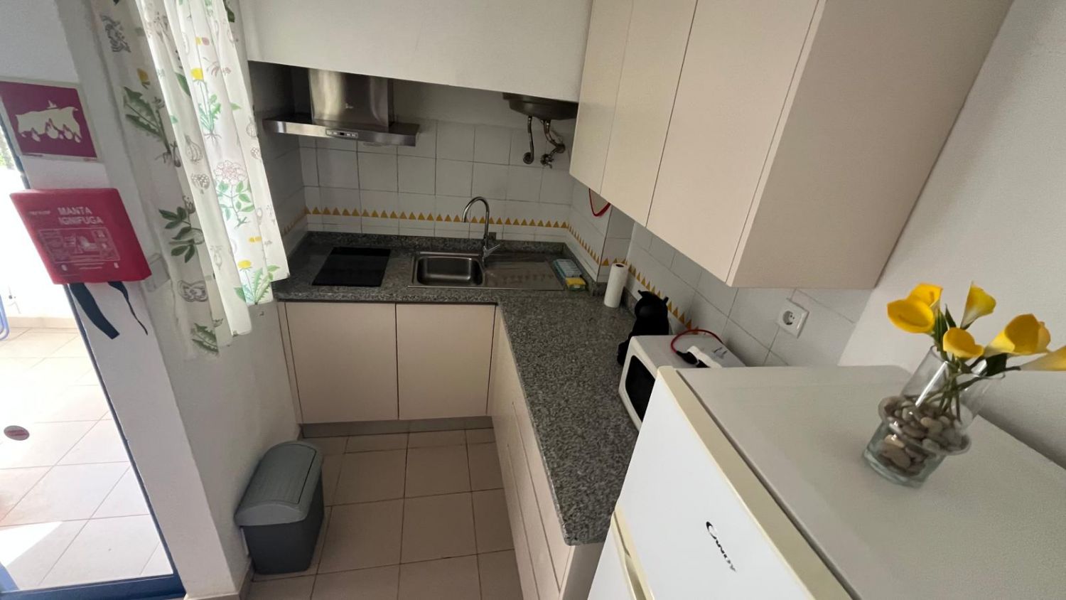 Cozinha equipada com: louça/talheres, trem de cozinha, máquina de café, torradeira,varinha, placa eléctrica, micro-ondas, frigorífico e outros utensílios