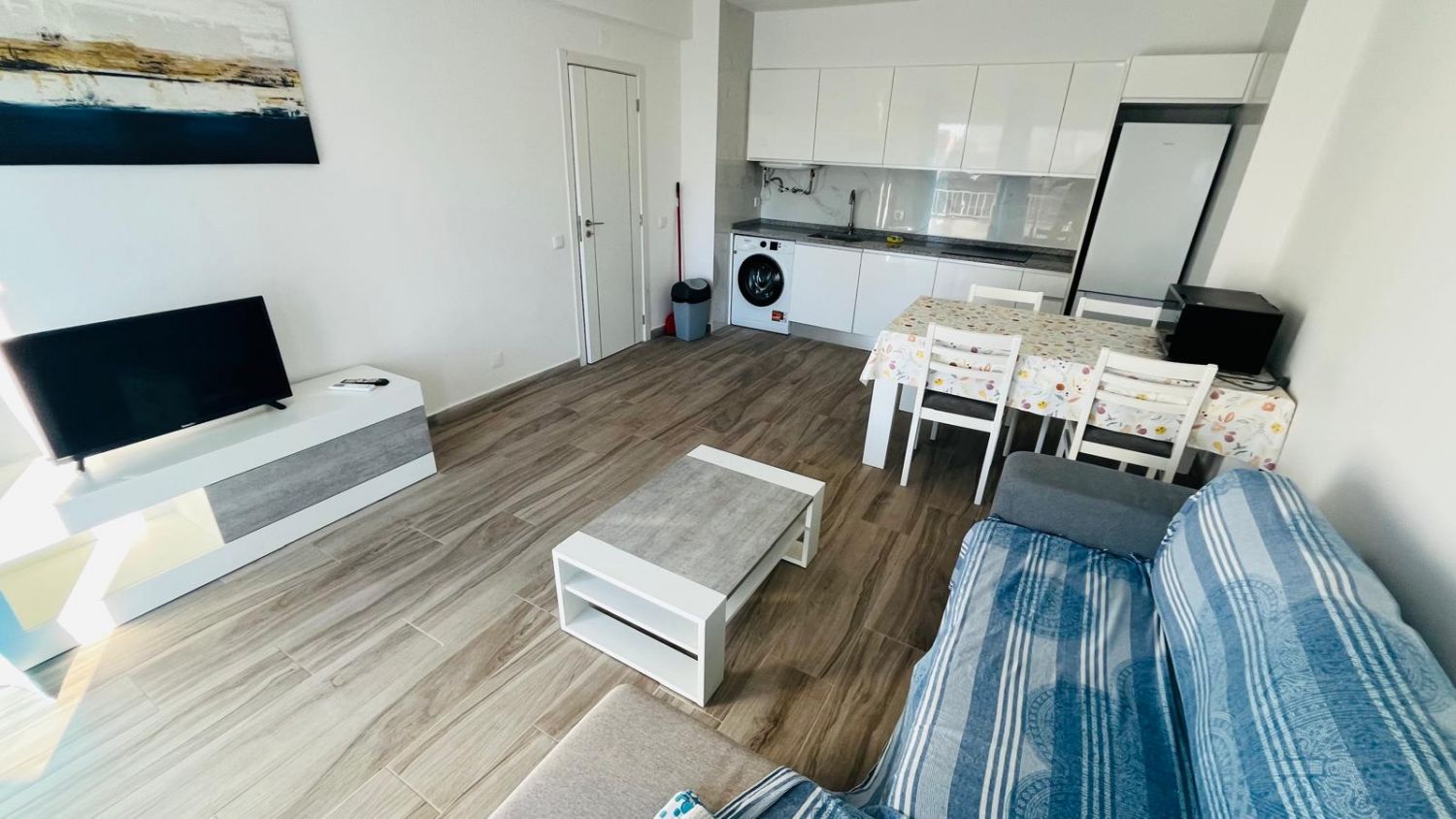Cozinha equipada com M. Lavar Roupa, talheres, trem de cozinha, torradeira, varinha, placa eléctrica, forno micro-ondas, frigorífico e outros utensílios.