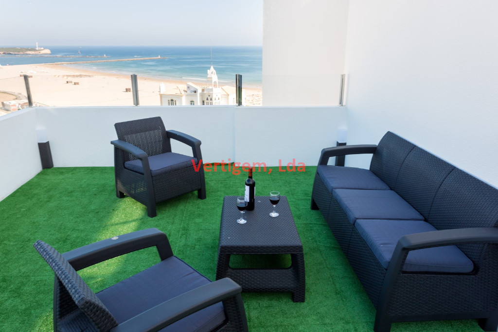 Terraço de 40 m2 com relva artificial para um melhor conforto e com um vista soberba para a praia, equipado com sofás relax, mesa de refeições e o sempre útil grelhador.